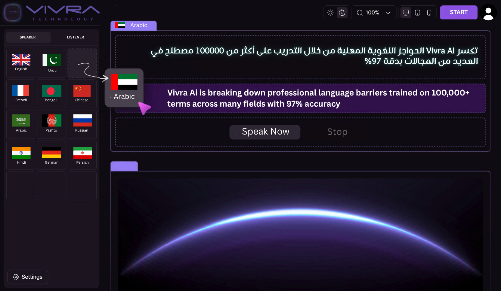- 02 Connect Your Audio Use your mic, streaming input, or existing sound system. VIVRA AI captures the live voice and instantly translates it into multiple languages.